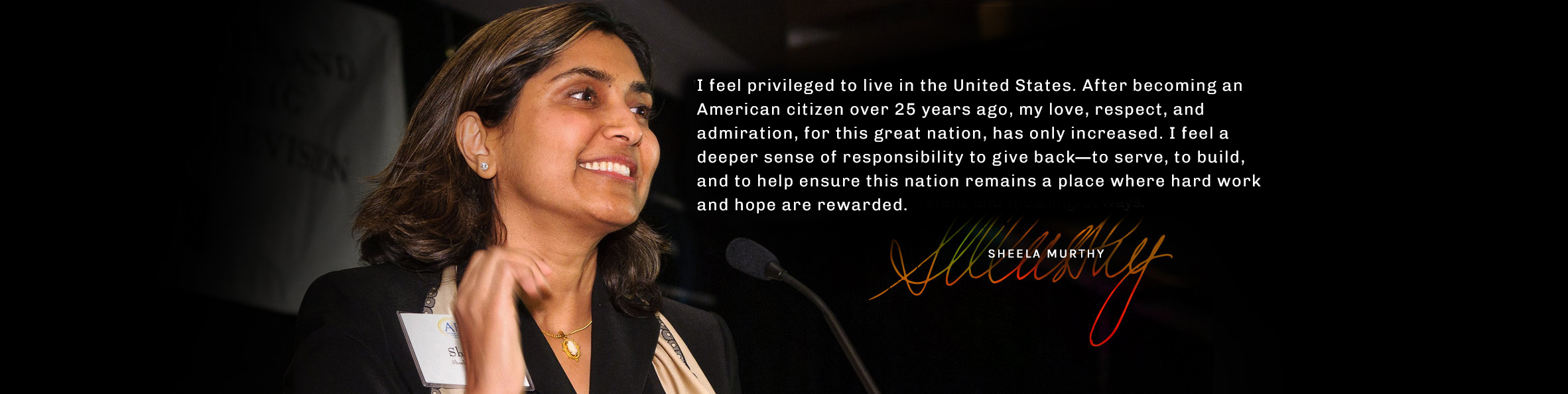 Following the events of 9/11, Sheela Murthy and Vasant Nayak responded by establishing the MurthyNAYAK Foundation, a family foundation created to support nonprofit organizations that serve women, children, and immigrants in the United States, especially around Baltimore, MD. They also support NGOs that serve women and children in India, particularly around Bangalore. Thus they work to give back to their adopted country and their native homeland.